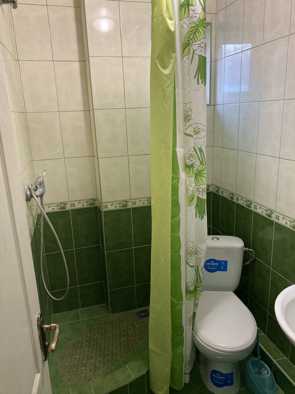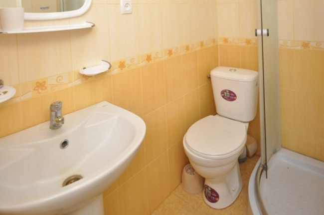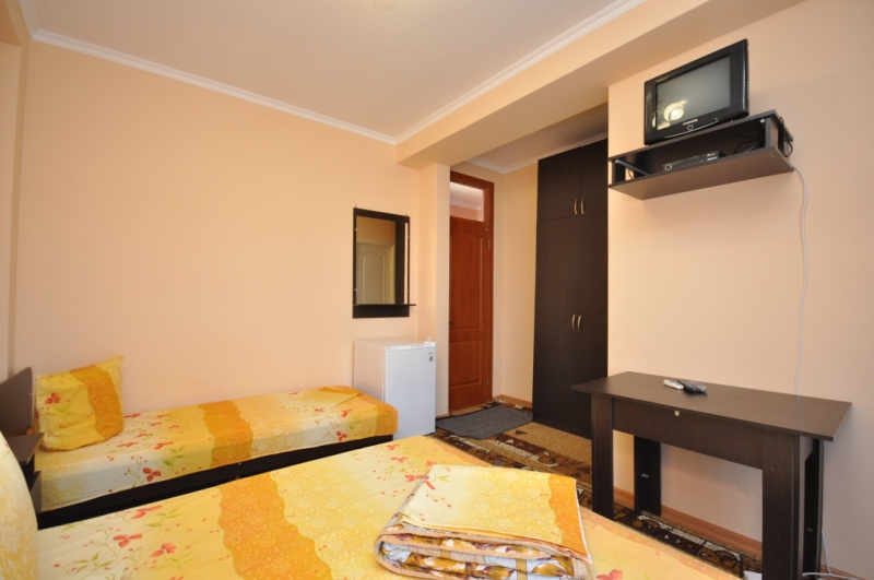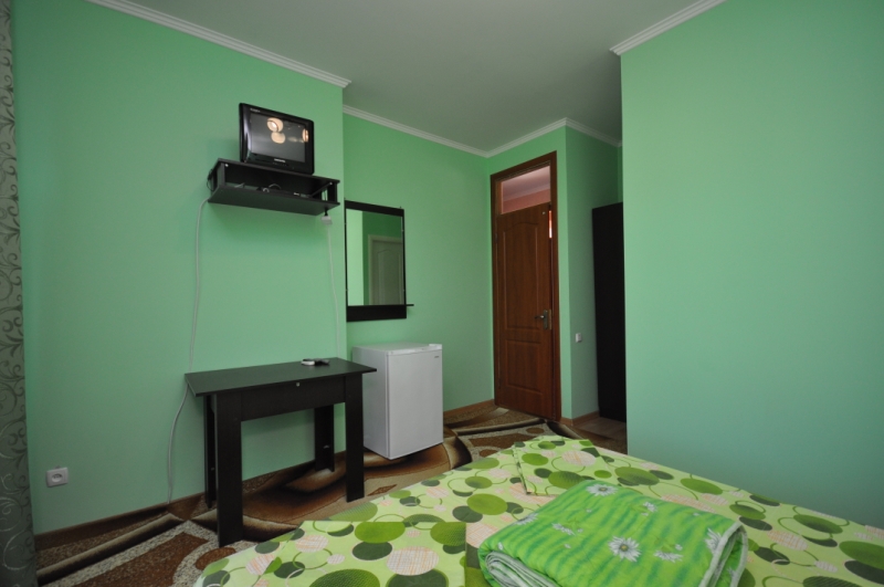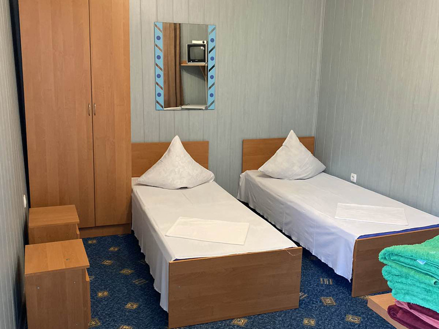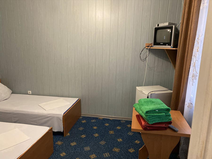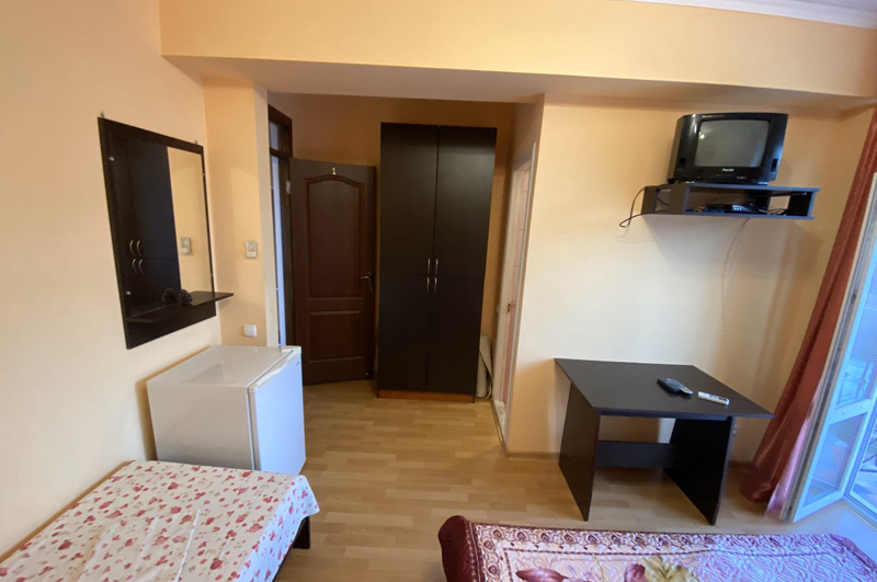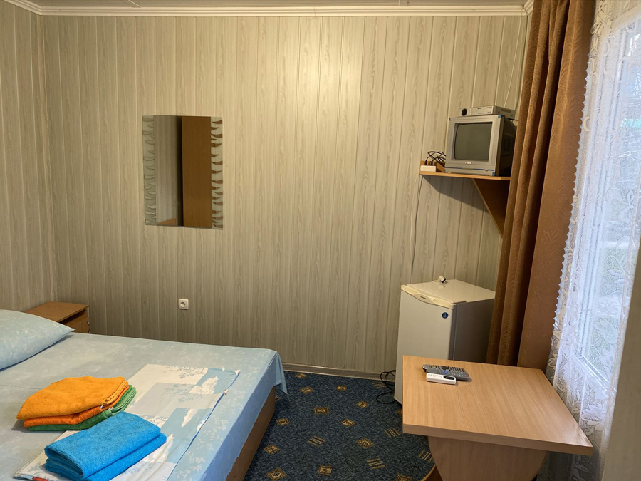 Компактный и светлый номер с двуспальной кроватью, кондиционером, телевизором, холодильником и санузлом — всё для спокойного отдыха.