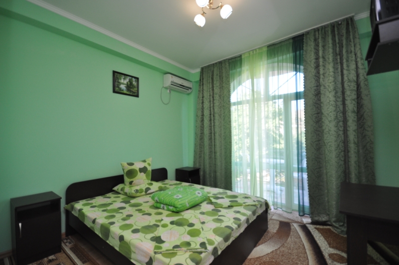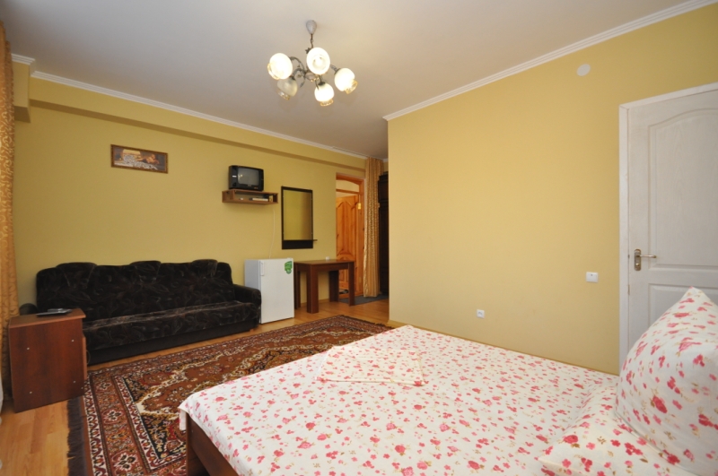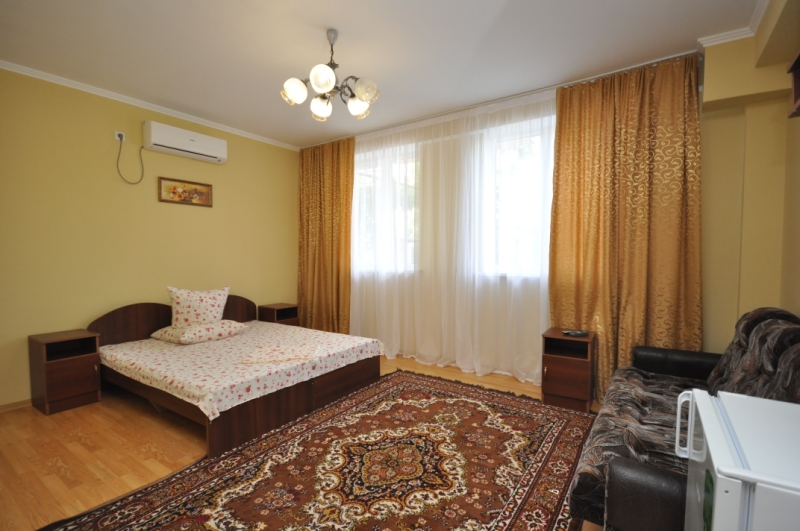 Уютный номер для четырёх гостей с двуспальной кроватью и диваном, кондиционером, телевизором, холодильником, чайником, феном и собственным санузлом.