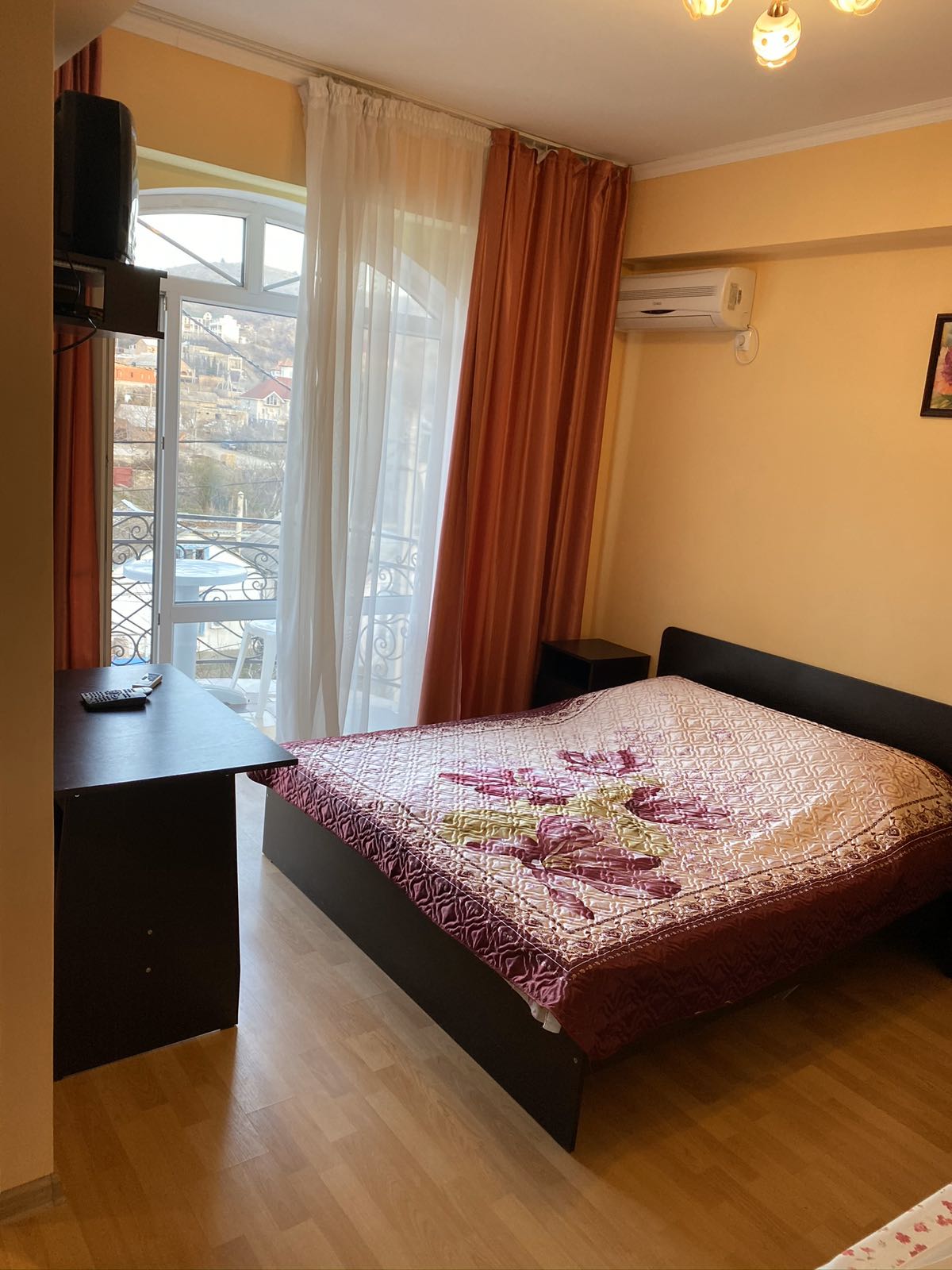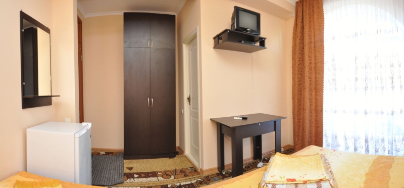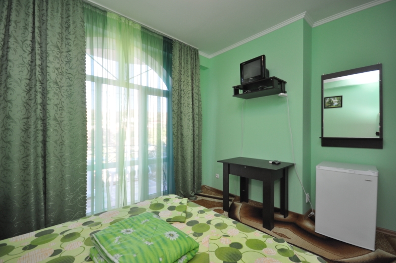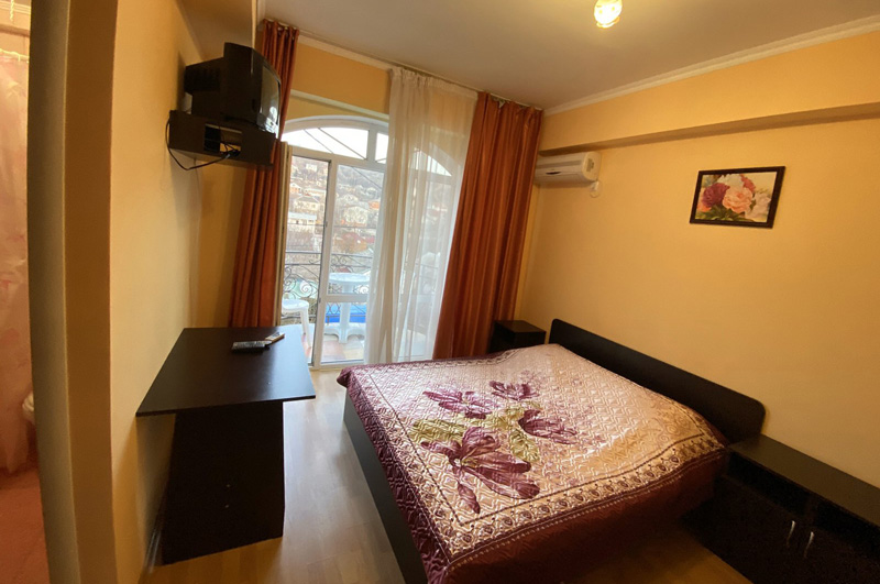 Этот номер подходит для комфортного отдыха вдвоём: двуспальная кровать, кондиционер, телевизор, холодильник, санузел и балкон с летней мебелью.