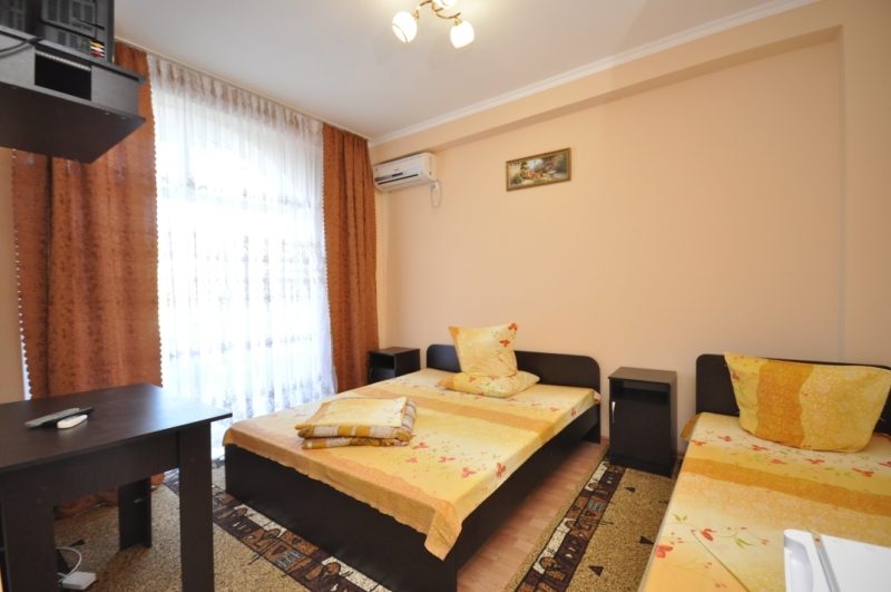 Просторный номер с двуспальной и односпальной кроватями, кондиционером, телевизором, холодильником, санузлом и балконом — отлично подойдёт для семьи.